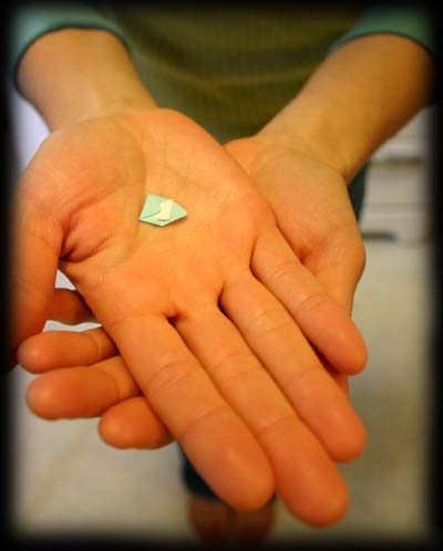 I made a miniature envelope and note card from a scrap of paper. I sharpened a pencil to the finest, tiniest point and sat down at the kitchen table to write the frog a letter.