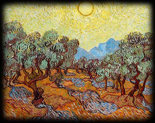 That night, I had a vivid dream. I was walking in a place with orange hills, trees with purple shadows, and distant blue mountains. The sun filled the sky with vibrations of light. On the path between the trees, I met a man with a beard made of brushstrokes.