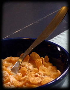 I poured us each a big bowl of cornflakes. Angelo attacked his with astounding zeal. Once he had eaten the crunchy flakes on top, he leaned far over the rim to reach the soggy dregs. When all that remained was milk, he dove into the bowl and began drinking great cheekfuls.
