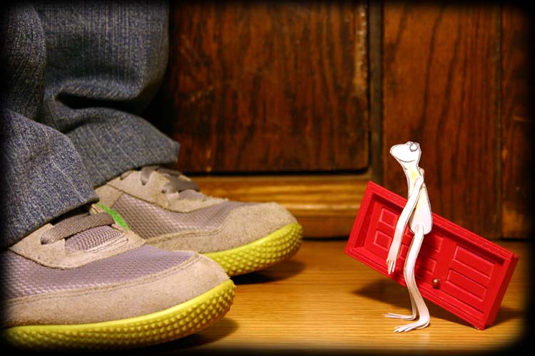 After breakfast, Angelo blew out the candles in his cereal box apartment and tucked the red door under one arm.